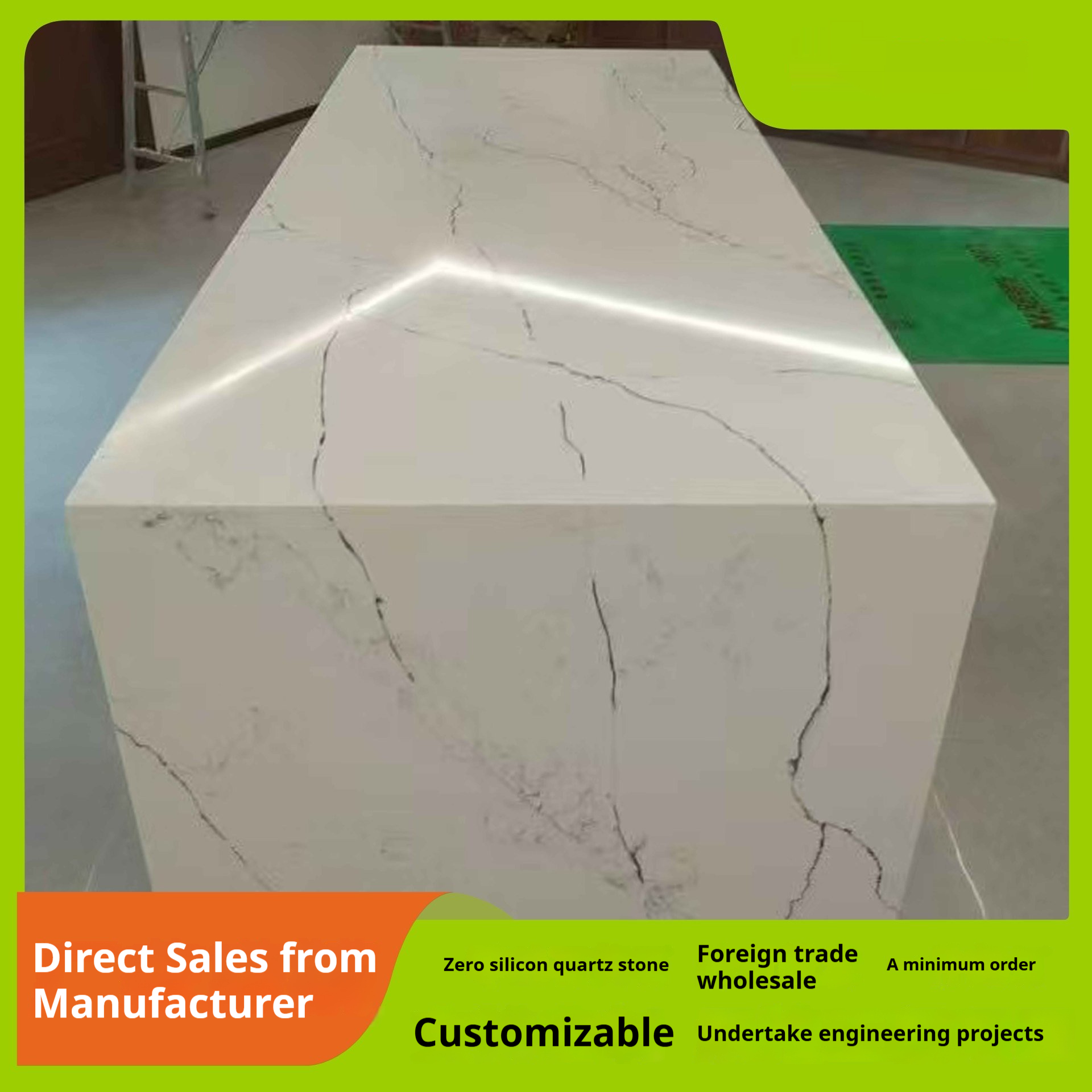 Silicone-free synthetic white quartz: large slabs for countertops, tables, and floors